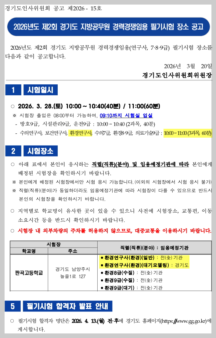 | 2026년 경기도 환경직 공무원 시험장소 / 경쟁률 [대방열림고시학원] (0) | 2026.03.20 |