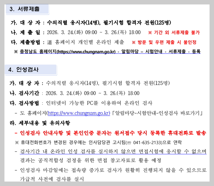면접 전에 서류 등록과 인성검사가 있으니 공고문을 잘 확인하시기 바랍니다.