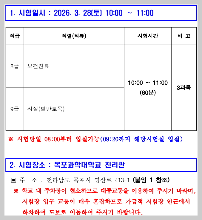 경력경쟁 시험의 시험장소가 공고되었습니다.