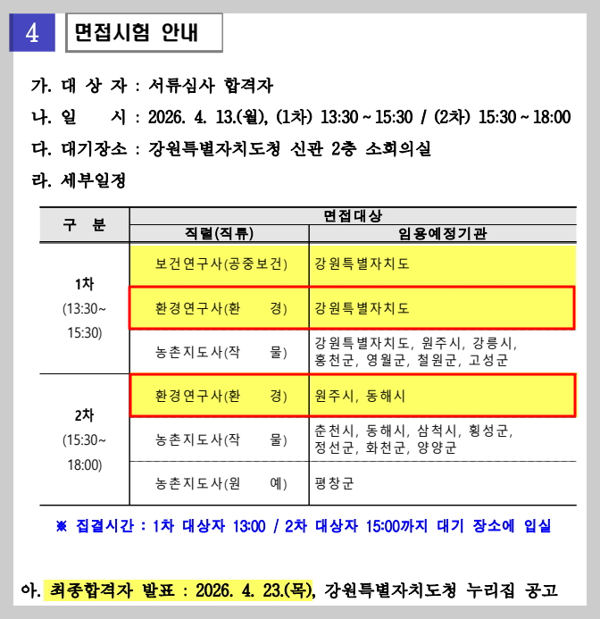 2026년도 강원특별자치도 환경연구사 공무원 시험의 면접일자는 4월 13일 월요일입니다.