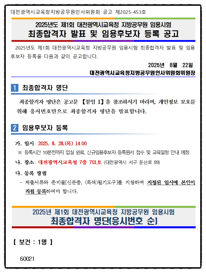 2025년도 대전광역시교육청 보건직 공무원 최종합격자 / 합격선, 경쟁률 [대방열림고시학원]
