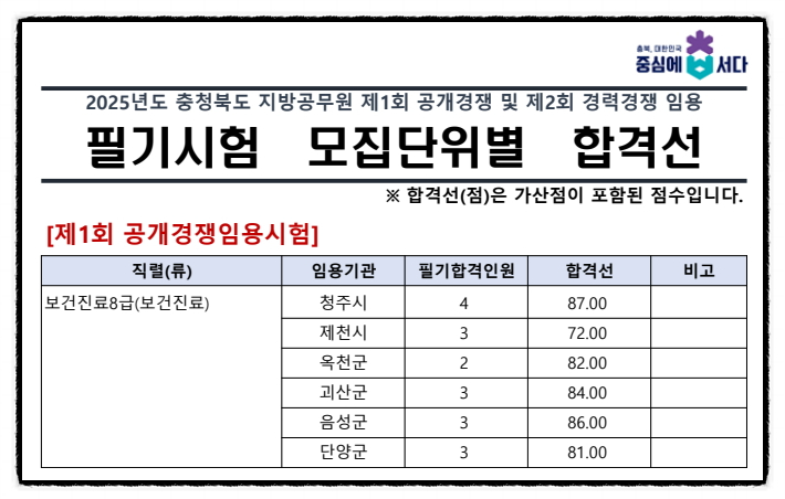 2025년 충청북도 보건진료직 공무원 시험의 합격선은 위와 같습니다.