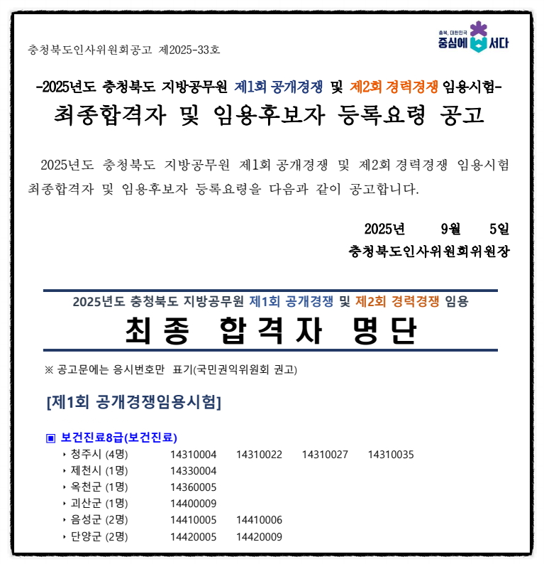 2025년도 충청북도 보건진료직 공무원 최종합격자 발표 / 경쟁률, 합격선 [대방열림고시학원]