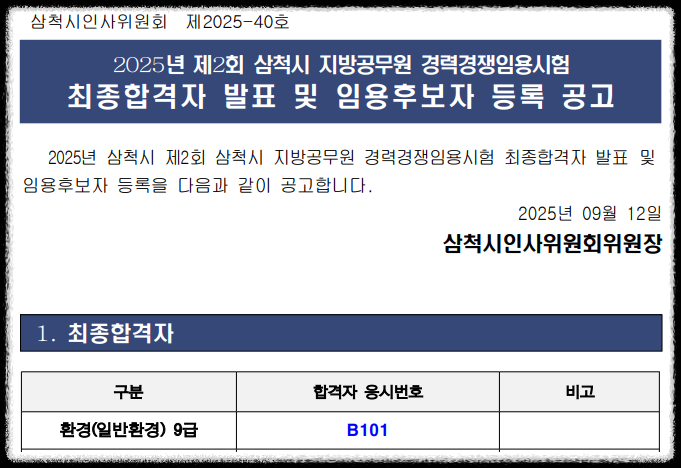 2025년 강원특별자치도 삼척시 환경직 공무원 임용 최종합격자 발표 [대방열림고시학원]