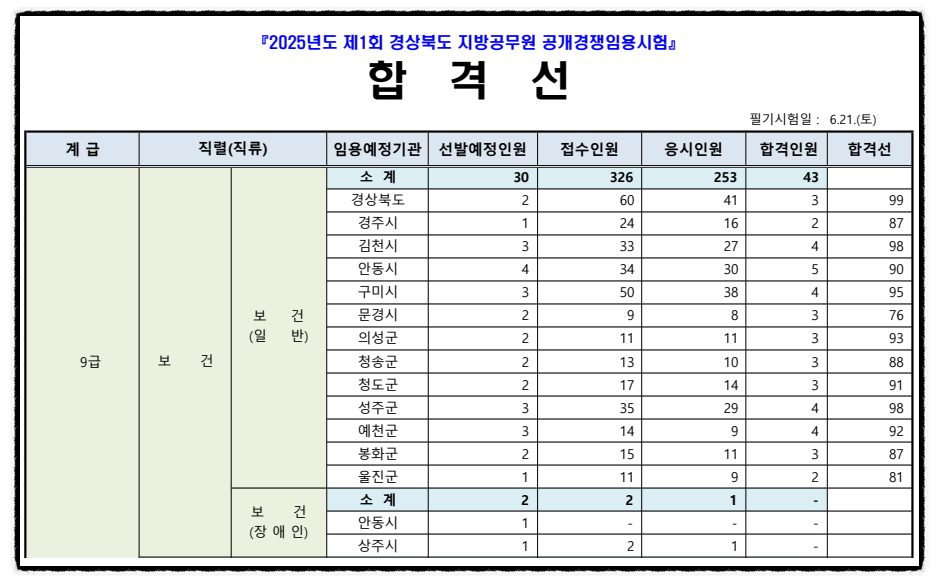 2025년도 경상북도 보건직 공무원 최종합격자 / 합격선, 경쟁률 [대방열림고시학원]