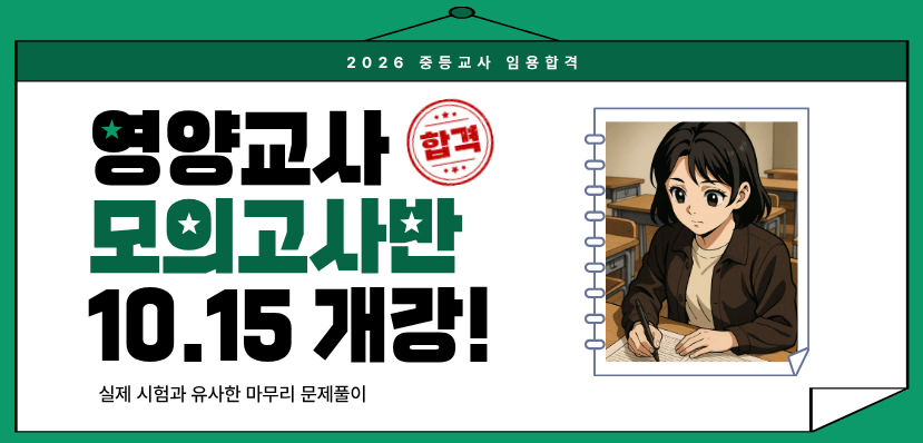 | 2026 영양교사 임용대비 최종 모의고사반 개강 안내 [대방열림고시학원] (0) | 2025.09.22 |