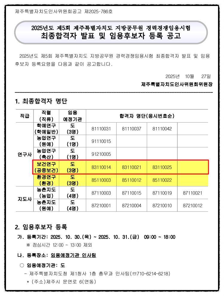 2025년도 제5회 제주특별자치도 보건연구사, 환경연구사 공무원 경력경쟁임용시험 최종합격자 발표 및 임용후보자 등록 공고 최종합격을 축하드립니다~^^ 자세한 내용은 첨부파일의...