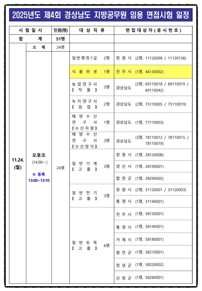 2025년도 경상남도 식품위생직 공무원 시험의 면접일자는 11월 24일 월요일입니다.