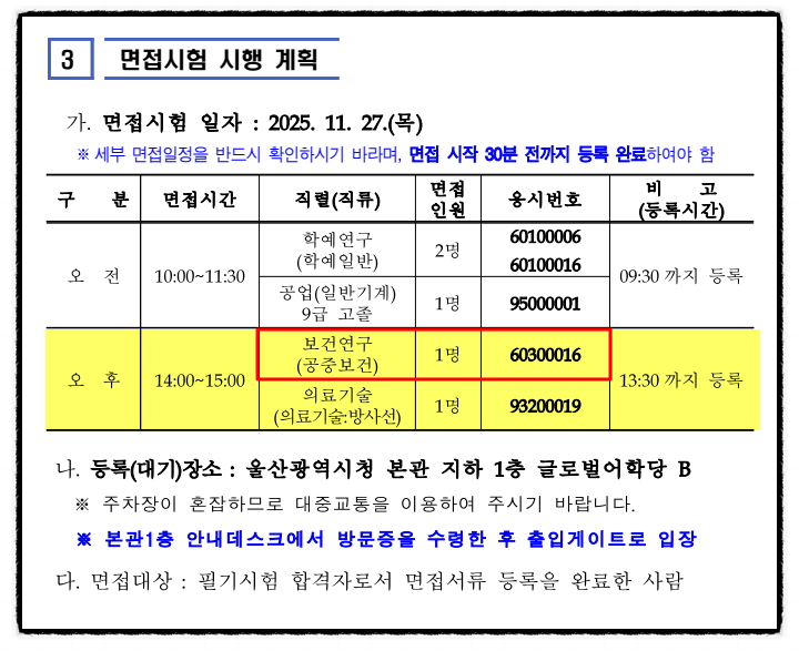 2025년도 울산광역시 보건연구사 공무원 시험의 면접일자는 11월 27일 목요일입니다.