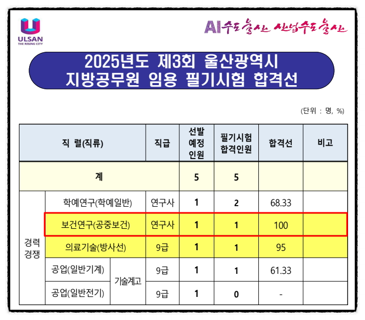 2025년 울산광역시 보건연구사 공무원 임용 필기시험 합격선 [대방열림고시학원]