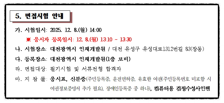 2025년도 대전광역시 보건연구사 공무원 시험의 면접일자는 12월 8일 월요일입니다.
