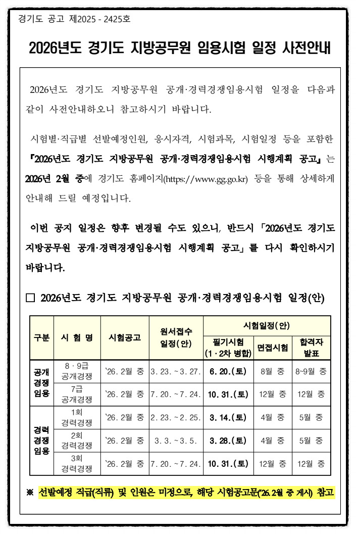 아래는 2026년도 경기도 지방공무원 시험 일정의 사전안내입니다.