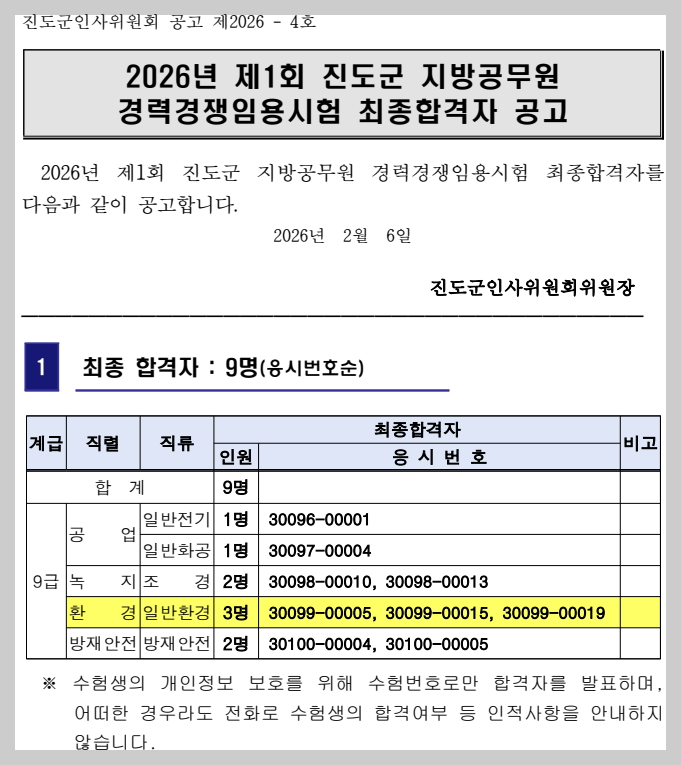 2026 전라남도 진도군 환경직 공무원 임용 최종합격자 발표 [대방열림고시학원]