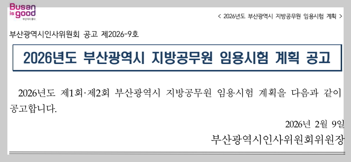 | 2026년도 제1회 부산광역시 환경직 공무원 공개경쟁 시험 공고 [대방열림고시학원] (0) | 2026.02.09 |